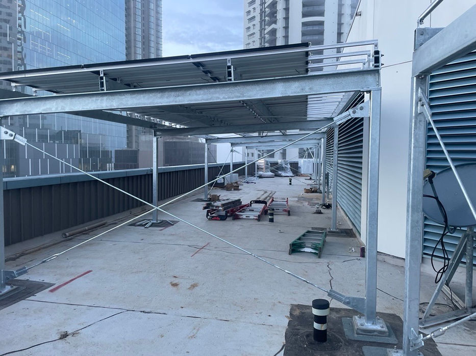 This rooftop solar farm project in Adelaide Street, Brisbane, features the installation of a high-efficiency photovoltaic system designed to supply clean, renewable energy to the urban environment. The structural framework supporting the solar array was engineered and installed by Australian Steel Projects, incorporating reinforced beams and vertical support poles to ensure stability, safety, and compliance with local building standards. The design maximises roof space utilisation while maintaining structural integrity under varying load conditions.
